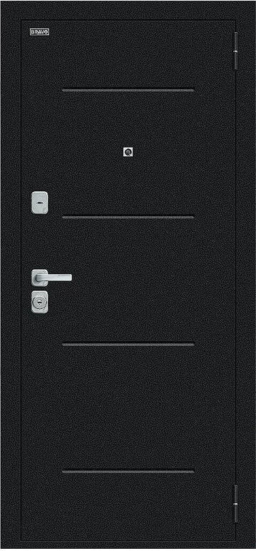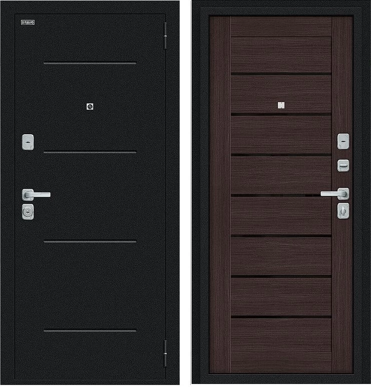 Надежная входная Дверь Браво Техно/BChrome Букле черное/Wenge Melinga премиум класса по цене 34 231 руб. Большая толщина стали защитит от проникновения в ваш дом, квартиру или коттедж. Используется очень качественная фурнитура: замки, цилиндры, ручки, защелки. Покрытие и отделка двери изготовлено под внимательным контролем производителя. Дверь имеет долгий срок службы и гарантию.